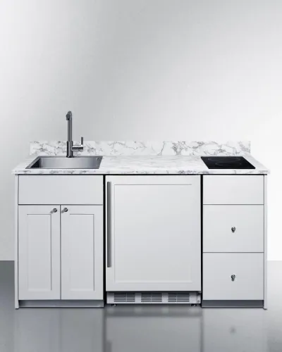The Caldera Kitchen series includes sleek, functional, and fully assembled kitchenettes, featuring a European refrigerator-freezer, a 115V powered induction cooktop, and a stainless steel sink complete with a faucet