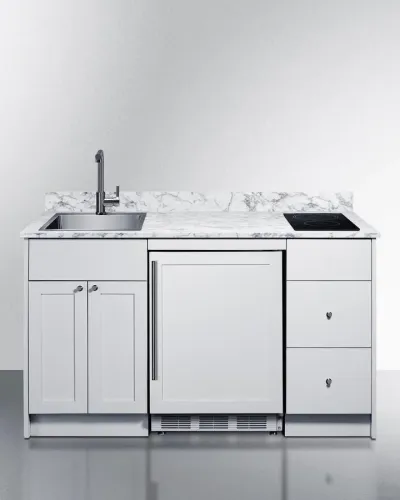 The Caldera Kitchen series includes sleek, functional, and fully assembled kitchenettes, featuring a European refrigerator-freezer, a 115V powered induction cooktop, and a stainless steel sink complete with a faucet
