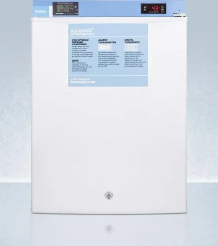 Thermometer probe is encased in a glycol-filled bottle and stored in a fixed box on the center shelf. This is the ideal way to produce temperature readings closest to stored contents, as recommended by the CDC, VFC and VFA's guidelines