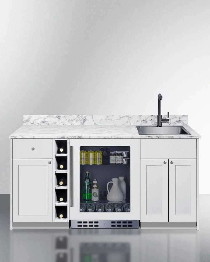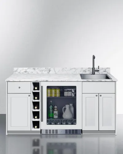 Set your cabinet in place, have a plumber install and connect your sink, and slide in the refrigerator to create your very own one-piece wet bar