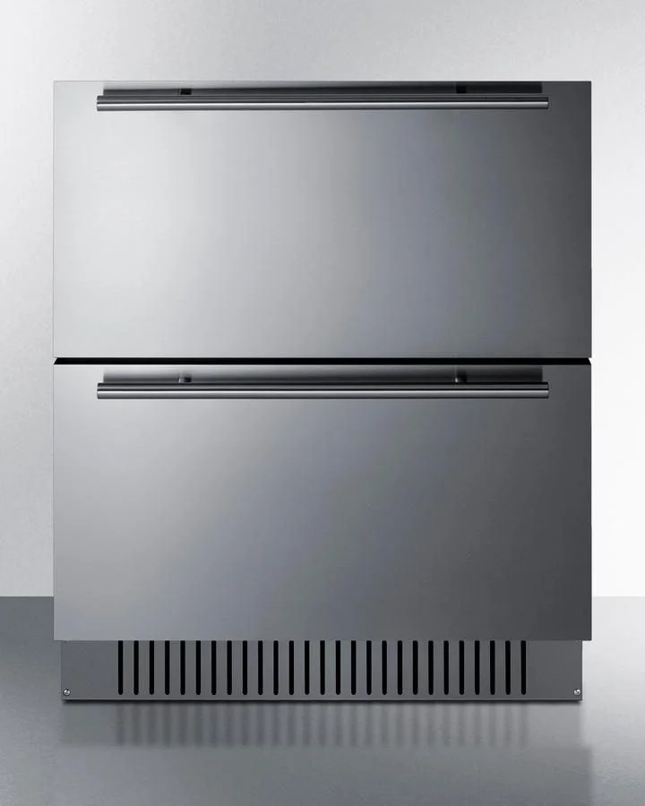 Interior and exterior drawer fronts feature weatherproof stainless steel construction in a horizontal grain for long-lasting luxury under the counter