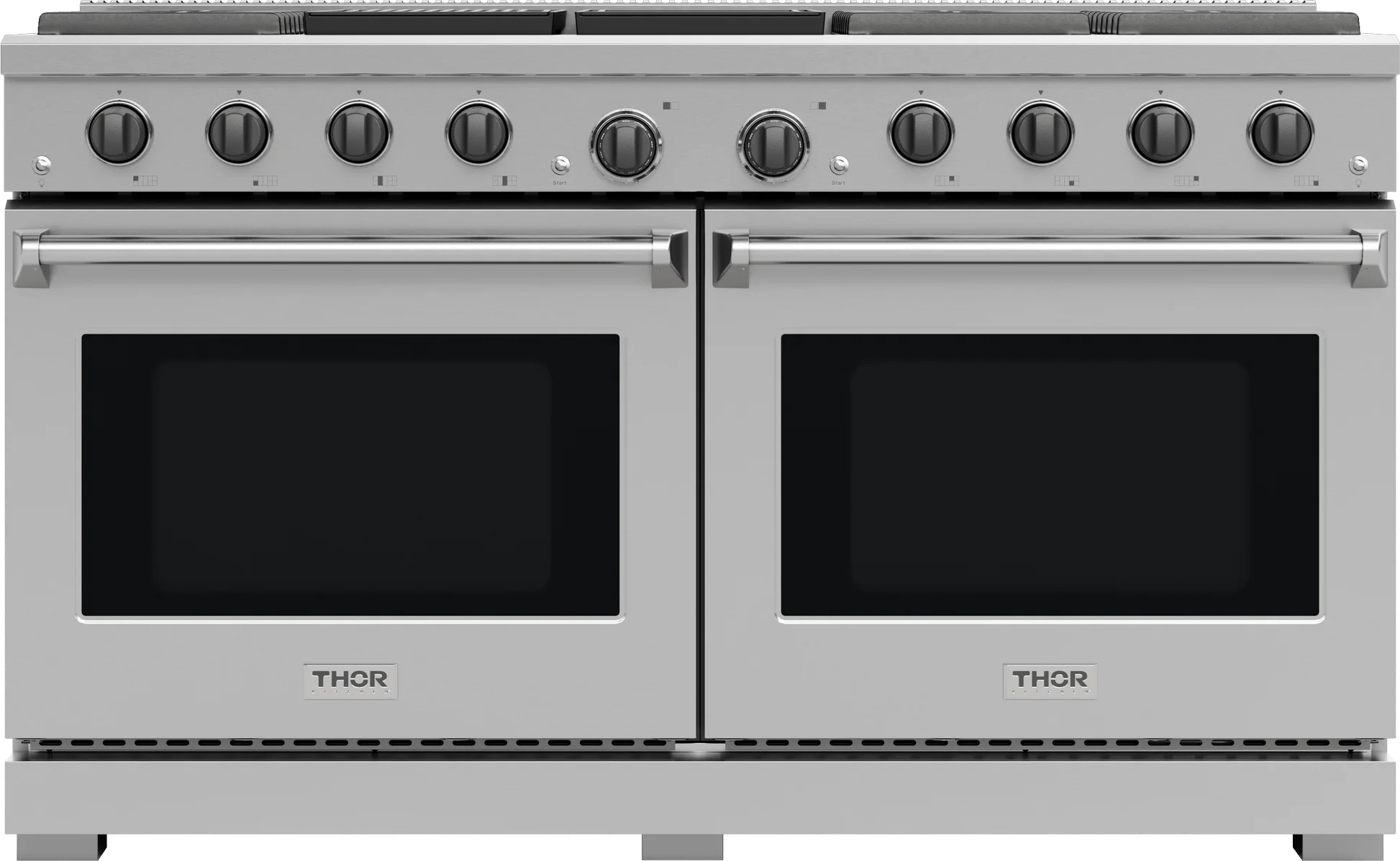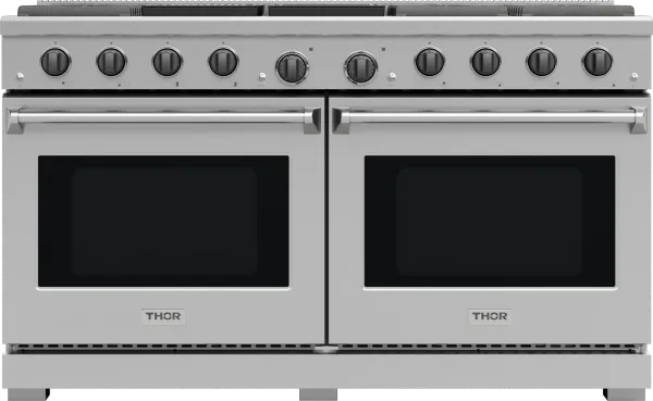 THOR Kitchen offers the power and performance of a premium professional appliance at a practical price. The two 4.8 cu. ft. ovens allow you to prepare multiple dishes simultaneously, perfect for hosting dinner parties or cooking large family meals. Effortlessly maintain a spotless kitchen with the black porcelain spill tray, which catches any messes and simplifies cleanup. The versatile 8-burner cooktop, ranging from a 3500 BTU burner to a powerful 18,000 BTU burner, gives you the flexibility to master any culinary challenge. Heavy-duty continuous cast-iron cooking grates provide stability for any size cookware, ensuring durability and reliability. The convection fan ensures fast and even cooking, while the large oven windows and bright halogen lights let you easily monitor your food without opening the door. With dual-function oven controls and high-temperature frying capabilities, this range is designed to bring out the professional chef in every home cook.