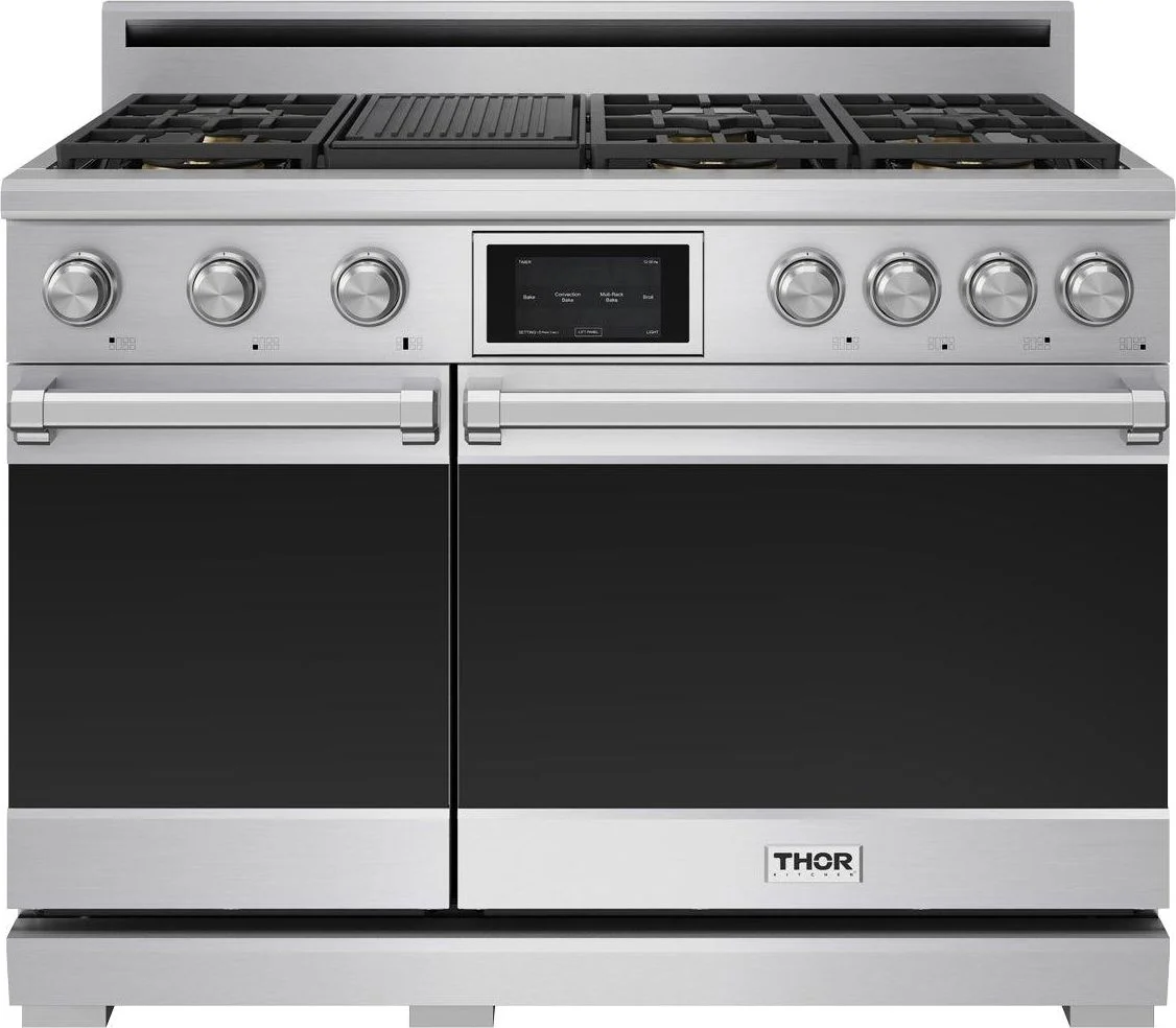 The THOR Kitchen XRD48E is a 48 inch professional dual fuel range built for ambitious home chefs, featuring Italian brass burners including three powerful 22,000 BTU dual flame burners, a griddle burner, and additional high output burners for versatile cooktop performance. It includes a double oven configuration (4.8 cu ft and 2.2 cu ft) with independent temperature controls and a wide range of cooking modes such as Bake, Broil, Convection Bake/Roast, Air Fry, Proof, and Self Clean, all managed from a responsive tilt panel touch control. Premium touches like luxurious telescopic racks, soft close oven doors, continuous cast iron grates, blue LED illuminated knobs, built in casters with leveling legs, and automatic re ignition enhance functionality and ease of use, while included accessories (broiler pan, air fry basket, meat probe, grill/griddle grate) expand versatility and convenience in the kitchen.