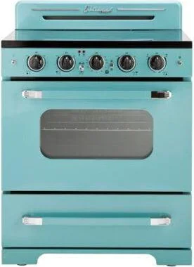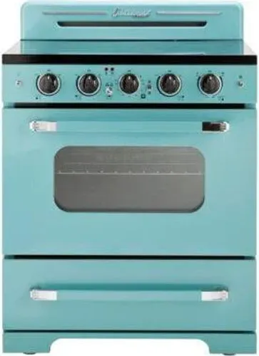 The 30 Classic Retro Electric Range transports you back to the 50s with its iconic retro design and chrome finished accents. It has a 5-element sleek glass electric cooktop capable of an intense sear or delicate sauce simmering. This range also allows for convection cooking circulating heat for incredibly even distribution.