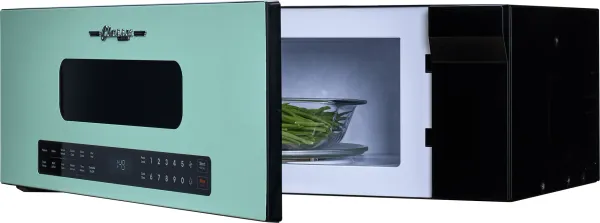 Unique Appliances Classic Retro 1.2 cu ft over-the-range microwave is designed to maximize kitchen space with its stylish slim design. With 7 auto cook options and a powerful 400 CFM adjustable fan speed, it makes mealtime effortless and keeps your kitchen free from smoke and o dors . Bright LED lighting and an easy-to-clean interior ensure a welcoming and hassle-free cooking experience.