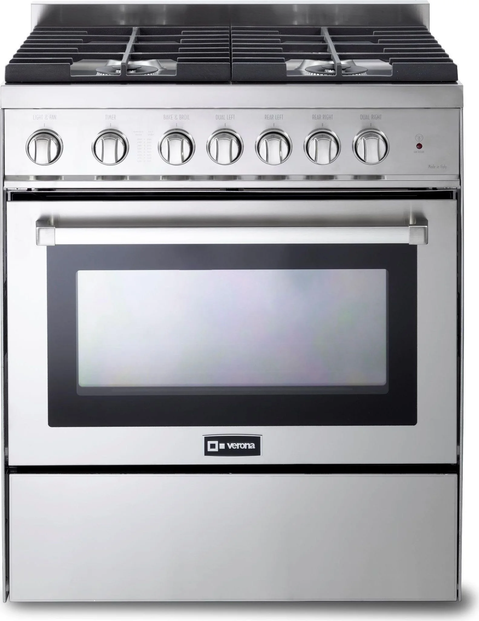 This Italian-made range comes equipped with four burners including two versatile power burners that provide up to 17,000 btus and can simmer down to 700 btus.