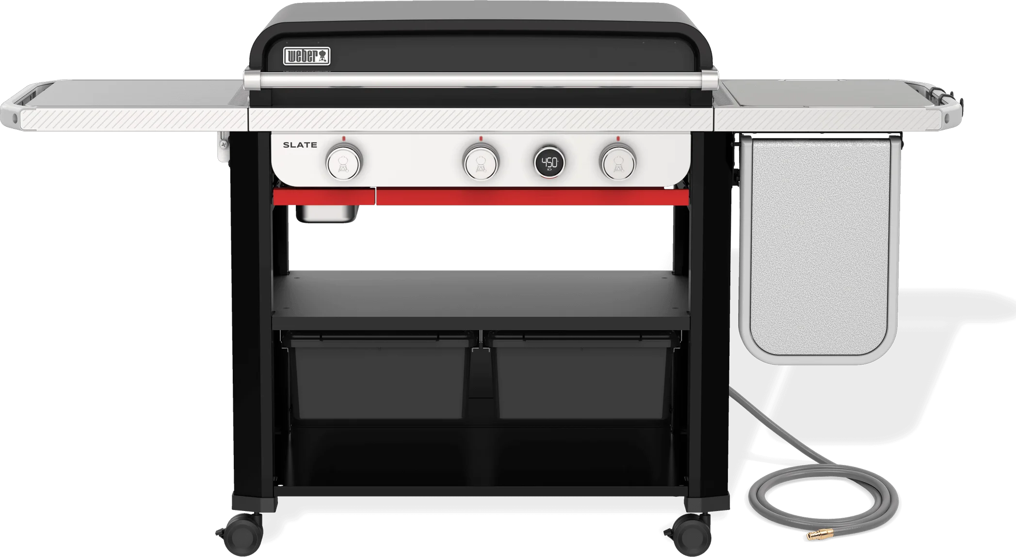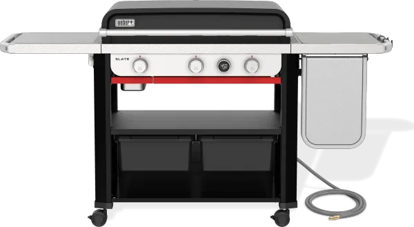 Weber Works(TM) Prep, Cook, and Store System accessories (sold separately) keep griddle supplies handy, transport things from the kitchen, convert the side table into a prep station, stow away gear, and more.