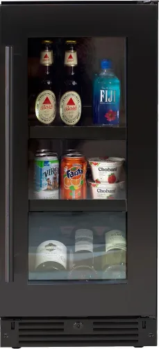 Clear glass shelves fully extend to reveal their contents and adjust to 15 different heights